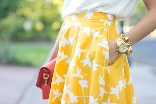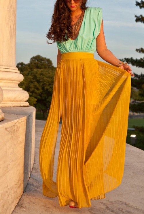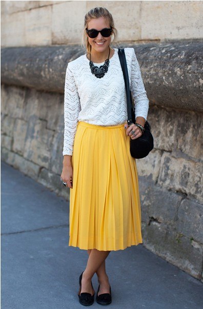 Что касается юбок – это очень женственно и сексуально априори, а вот желтый цвет в свою очередь привносит кокетства,получается по-девичьи свежо и привлекательно. Очень хорошо, по-летнему выглядят комплекты, где желтый сочетается с кипенно белым либо пастельными цветами холодного оттенка. Локально использовать матовый желтый нужно аккуратно,если и хотите примерить юбку в пол желтого цвета, то она должна быть из легкой струящейся, полупрозрачной ткани. Необязательно выбирать однотонные, комбинируйте принтованные юбки, в которых преобладает желтый.